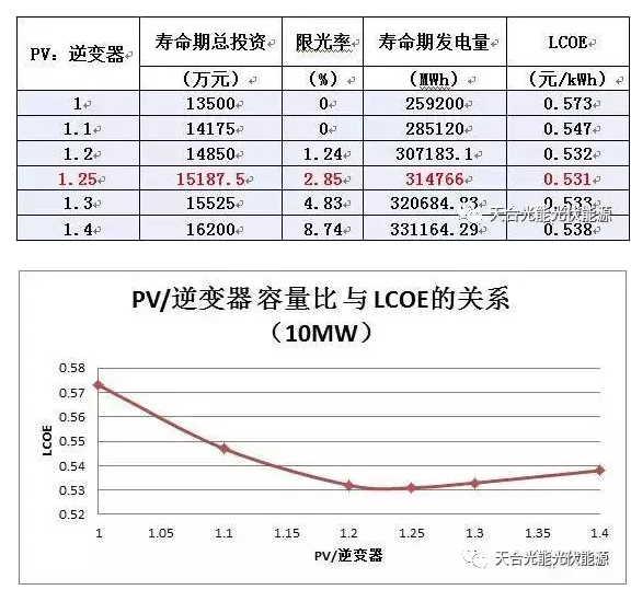 以上数据为青海格尔木地区的模拟计算数据,可以明显看出随着逆变器配比的增加,总投资是逐渐递增的,对应的收到逆变器影响的限光率也在逐渐增加,尽管如此,整体项目在寿命期的总发电量确在逐步递增,而我们用于评价电站经济效益的LCOE指标确是先降低,后增加。降低说明随着配比的增加,虽然增加了项目总投资,但是发电量的增加效果更加明显,而随着配比进一步增加,总的工程造价的增加并不能继续为电站带来更高的发电量了,所以LCOE反而又开始升高。