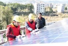 2017年1月10日,江西遂川县供电公司服务队在该县珠田村为光伏发电扶贫户王有生检查太阳能电板。