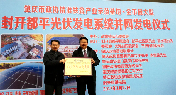 市政协主席孙德为捐资100万元建设光伏发电项目的肇庆政协香港联络处代表颁发牌匾。