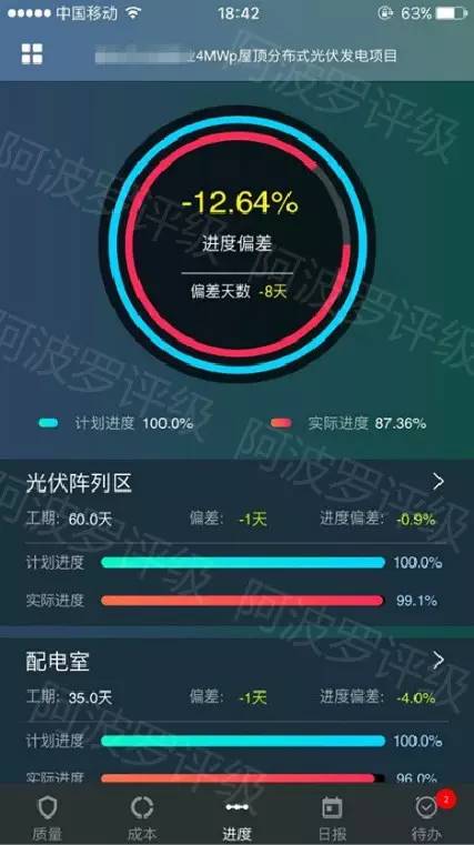 当进入全面施工阶段后,施工人员使用手机app客户端对施工细节进行拍照记录,并自动生成工程日报;同时,监理在线填写监理日报反映现场情况及问题,根据质量工单抽检现场施工情况并上传拍照记录以便比对。系统后台会自动生成并推送每日工程日报,对比施工方以及监理方上传的记录,简化工程现场案头工作的同时保证了工程进度以及工艺质量信息对收购方的全透明。通过阿波罗评级团队对该项目EPCM过程性管理记录的复核及审计,为资金方按照事先约定的标准分批付款提供建议。通过采用EPCM创新的管理机制,工程付款同项目质量以及进度直接挂钩得以实现,各类质量问题反馈以及整改的速度得到了大幅提升。