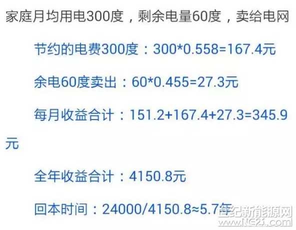 明白了上网模式,接下来在来说说大家普遍关心的收益问题,节省的电费国家补贴及部分地方补贴,卖电给电力公司的电费收入。按照3KW家用分布式系统为例(按照电费0.558元,脱硫电价0.455元)。