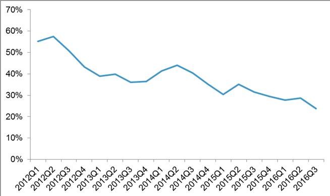 图1:2012~2016年单晶市场份额情况