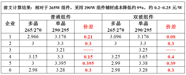 如果单晶采用高效组件,如290Wp,则相对于265Wp的多晶组件,辅材成本可以降低约9%,即0.2~0.25元/W之间。