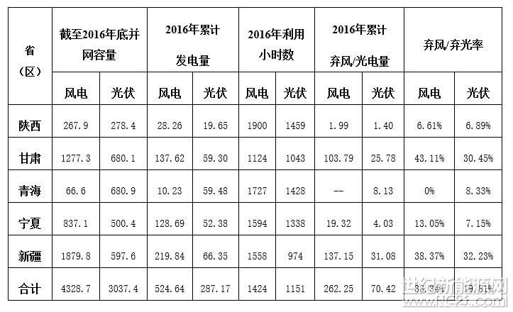 2016年,西北五省(区)新增光伏发电并网容量1011万千瓦,截至2016年年底,累计并网容量3037万千瓦,占全网总装机的13.8%。2016年,光伏发电量287.17亿千瓦时,占全网总发电量的4.57%;利用小时数1151小时,弃光电量70.42亿千瓦时,弃光率19.81%。西北五省(区)中,新疆、甘肃光伏发电运行较为困难,弃光率为32.23%和30.45%。此外,宁夏弃光率7.15%,青海弃光率8.33%,陕西首次发生弃光限电情况,弃光率为6.89%。