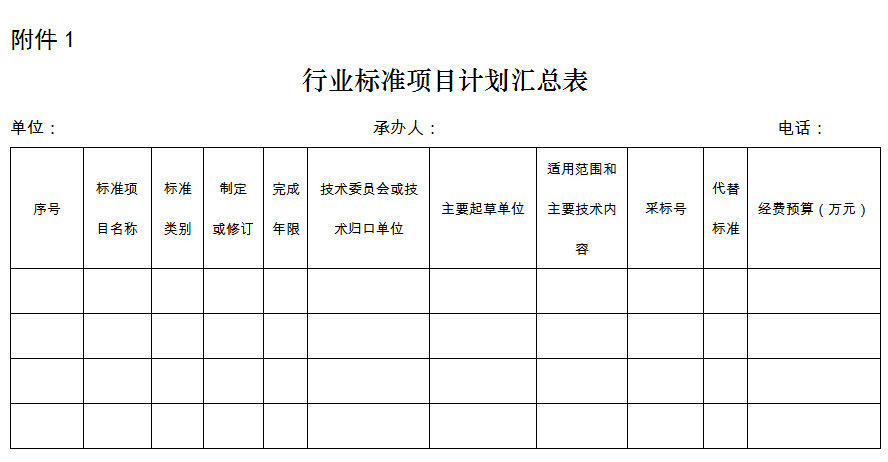 1、请认真准备行业标准项目计划汇总表和行业标准项目任务书(格式见附件)。标准项目计划汇总表中的“适用范围和主要技术内容”将作为后续征求意见的主要依据,行业标准项目任务书中的“目的和理由”中请注明标准计划项目对行业工作急需的支撑作用。
