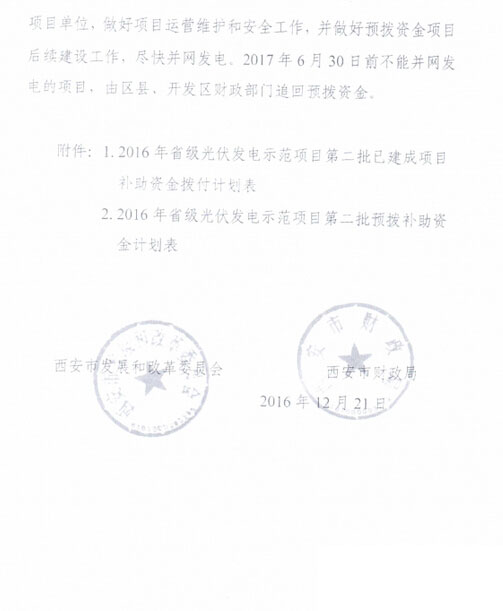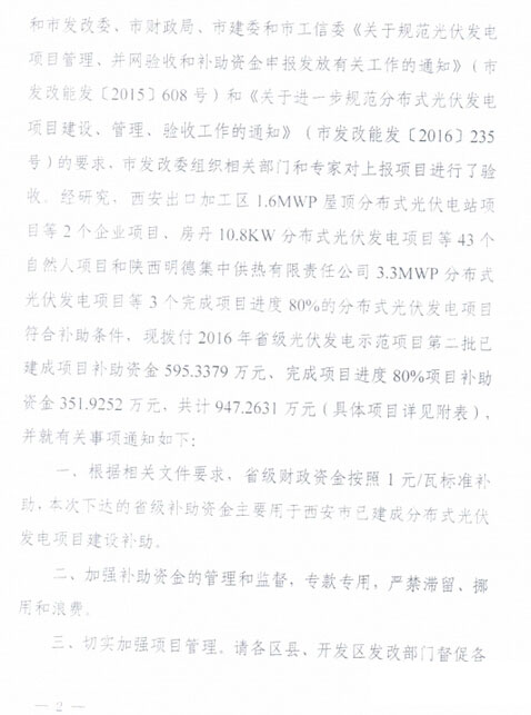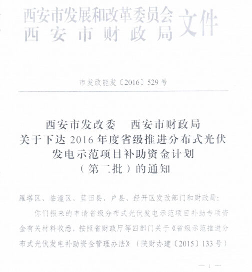 根据陕西省财政厅等四部门的分布式补助资金管理办法文件(2015-133号)和市发改委补助细则文件(2015-608号),西安市发改委和财政局于2016年底下拔了第二批的分布式光伏发电项目补助资金。