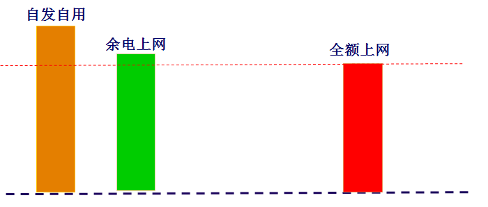 当“自发自用电价>全额上网电价>余电上网电价“时,如下图。在此情况下,必须要衡量”自发自用比例“,才能判断哪种模式的经济效益更好。