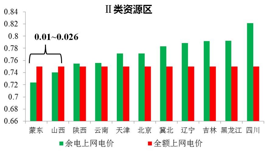 除了Ⅱ类电价区两个省,Ⅲ类电价区部分地区的“余电上网电价“略低于”全额上网电价“1~9分/kWh,其他地区“余电上网电价“均高于”全额上网电价“。