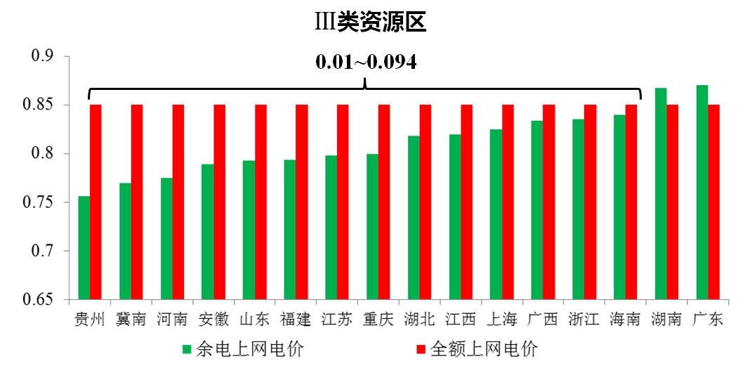 毫无疑问,自发自用电价>全额上网电价;对Ⅰ 、Ⅱ、Ⅲ类电价区的“余电上网电价“和”全额上网电价“进行比较,如下图所示。
