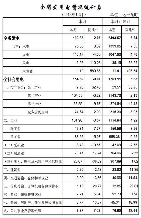 2016年,全省电力战线团结一致,克难奋进,经过不懈努力,确保了全省电网安全稳定运行和电力正常供应,圆满完成了各项政治及抗灾等保电任务,电力直接交易取得突破性进展,为全省经济社会发展及改革作出了应有贡献。截止年底,全省全口径装机容量6745.49万千瓦,同比增长5.22%;全年发电量2493.57亿千瓦时,增长5.84%;全社会用电量1763.11亿千瓦时,增长5.88%,其中工业用电量1114.94亿千瓦时,增长1.92%。