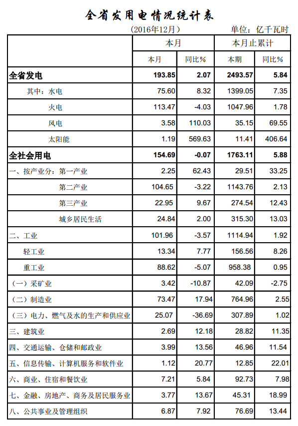 (一)全口径发电量稳步增长,发电计划执行情况良好。全年全口径发电量2493.57亿千瓦时,增长5.84%,其中,三峡电厂发电930.57亿千瓦时,增长7.56%。不含三峡,全省发电1563.00亿千瓦时,增长4.85%,其中水电468.48亿千瓦时,增长6.95%;火电1047.96亿千瓦时,增长1.78%。全年发电计划完成率100.33%,其中,水电102.11%,火电97.95%,风电102.19%,太阳能103.71%。