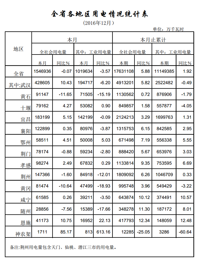(五)全省各地区全社会用电普遍增长,“一主两副”顶天作用显著。全省14个用电统计地区中,武汉等13地全社会用电同比增长,其中咸宁、随州、恩施3地全社会用电增幅在两位数以上,仅神农架林区1地全社会用电下降。从工业用电情况看,宜昌等9个地区用电增长,武汉等5个地区小幅下降。“一主两副”城市武汉、宜昌、襄阳3市全社会用电量占到全省的47.38%,工业用电量占全省的45.43%,均几乎占到全省半壁江山,3市全社会和工业用电的稳健增长对全省用电增长起到稳定的基石作用。