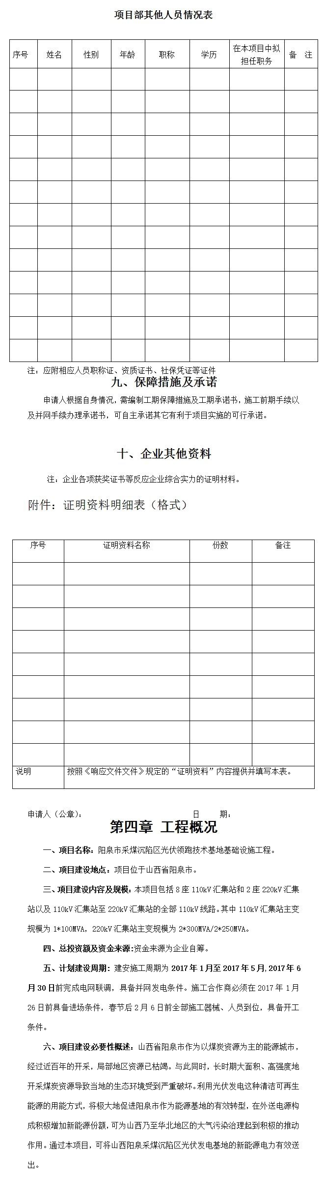 2.项目简介:为推动国家光伏产业升级转型,引领电价下降,调整以煤电为主导的产业结构,在阳泉市采煤沉陷区建设国家先进技术光伏发电示范基地,其中基础设施部分由上海院负责EPC总承包,根据基础设施EPC项目施工情况布局,施工业务共分14个段,其中:220kV汇集站2个,110kV汇集站8个,110kV输电线路4条,建安施工周期为2017年1月至2017年5月,2017年6月30日前完成电网联调,具备并网发电条件。施工合作方必须在2017年1月26日前具备进场条件,春节后2月6日前全部施工器械、人员到位,具备开工条件。