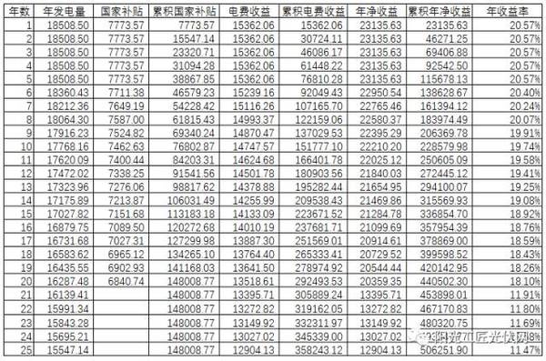 光伏发电系统年发电量的大小,会受光伏组件安装角度、受光面方位角、光伏组件局部遮阴、逆变器效率、输电损耗等因素影响,综合以上根据项目所在地气象数据测算,项目运营首年发电量为 1.8万kWh,25 年年平均发电量为 1.72万kWh;25年累积收益50.62万元,详见下表(注:项目所采用的光伏组件光电转换效率衰减按 12 年小于 10%、25 年衰减 20%计算)