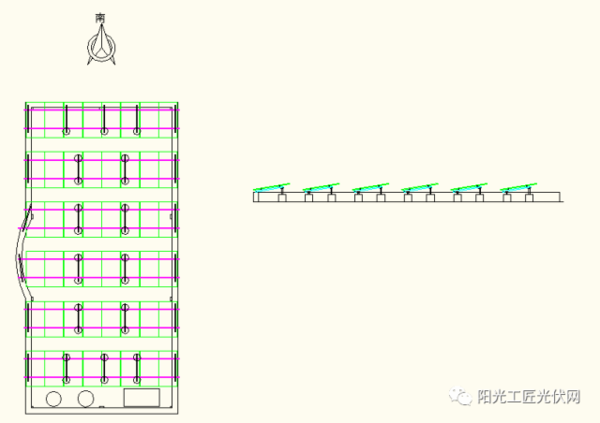 1、15KW共计48pcs光伏组件,按8pcs*6排列,倾斜角度10度。阵列最高处0.96m,最低处0.66m