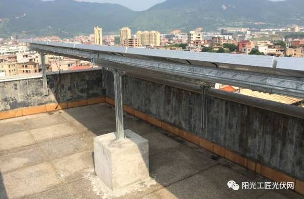 2、每个阵列中间用水泥基础做支撑,既不破坏原有屋顶防水结构,又很好的搭配了阵列的整体配重,做到了防风、防寒、防热的多重效果