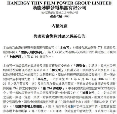 当天,香港证监会也在其网站就汉能薄膜五位现任及前任董事所涉及的证券及期货条例第214条民事程序发布新闻,对相关问题进行了陈述。