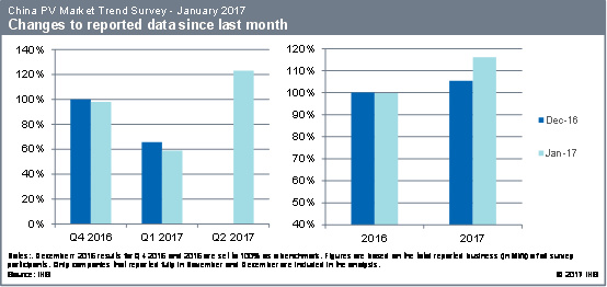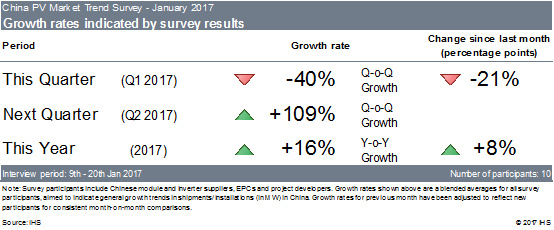 由于冻土期和农历春节的存在,1季度通常是装机淡季。而2017年的1季度会显得尤其冷清。IHS Markit认为,这同光伏补贴电价的最终确认有关。中国2017年的光伏上网补贴电价终于在2016年12月下旬宣布,大体上符合IHS Markit之前的预期。而新的630并网节点也减轻了集成商的压力,因此会有相当数量的项目完工期限将从年底推迟到2季度。但由此也会进一步削弱1季度的装机量。在1月份的调查中,2017年1季度的装机量比12月的结果再次下降了21个百分点,达到了40%的降幅。