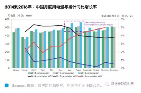 需求复苏:根据中电联的数据,上年11月份,中国的电力需求环比增长7%,同比增长近5%。这段时间内的需求复苏,主要是受到国内轻工业和制造业强劲增长的影响。此外,中国重工业领域的用电情况保持稳定,第三产业(主要是服务业)和居民用电需求继续快速增长。2016年,中国第三产业和居民用电在新增总用电量中的占比超过50%,这说明消费者侧的需求将成为未来电力市场增长的主要驱动力