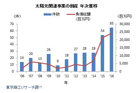 日本调研机构东京商工Research发表2016年太阳能发电相关企业的调查报告,显示去年有65家相关企业倒闭,较2015年增加了20.4%,数量是自2000年展开调查之后的新高。不仅如此,总负债额与大规模破产的数量也都是历年最高。