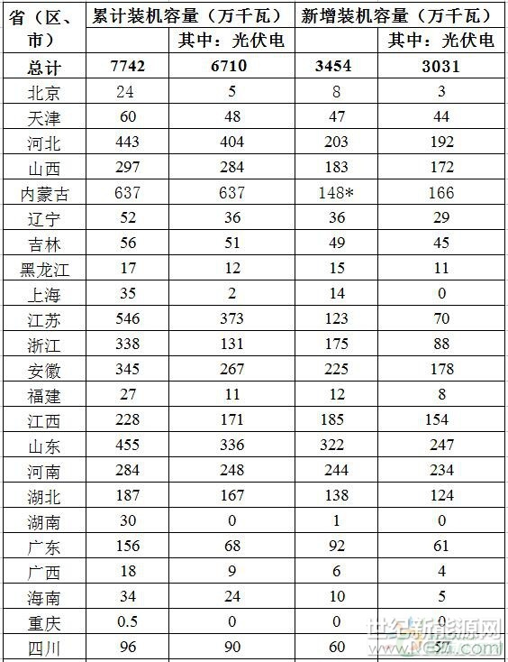 *注:2015年内蒙古、新疆的分布式发电统计数据存在误差,分别为18万和4万千瓦,在本表数据中进行了相应核减,故两省新增装机容量小于其光伏电站装机容量。