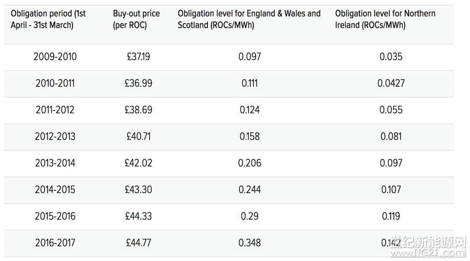 这里涉及到了一个市场供需关系问题。如果市场上的ROC供应数量大于其强制购买要求,那么证书的价格必然会被打压。所以ofgem会根据预测发电量上浮10%来设定ROC购买需求。这样又不会造成ROC大量短缺,从而保证一定程度的市场竞争,稳定证书价格。下表(引自ofgem)中间一栏描述了过去八年的ROC单位用电要求。我们可以看到这一标准从09年的0.097每兆瓦时上升至了16年的0.348每兆瓦时。反映了英国可再生能源发电比例的不断上升。也侧面说明了售电商在购买牌照方面的开销在不断增大。