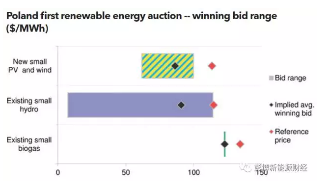 光伏发电赢得了政府的支持。波兰计划在未来4年内将光伏的装机总量提高10倍。在本次小规模项目的首次拍卖中,76个新项目获得了补贴,装机总量达到70MW左右。中标价格从62美元/MWh到100美元/MWh不等,预计平均价格为86美元/MWh。
