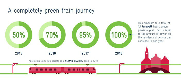 在荷兰,每天有60万人乘坐火车,车次多达120万趟,这需要风力发电每年12亿KWh的电,相当于整个阿姆斯特丹居民一年的耗电量。荷兰铁路的能源供应商Eneco和荷兰铁路的合作从2015年开始,比预期提早一年实现了火车100%的风能供电!