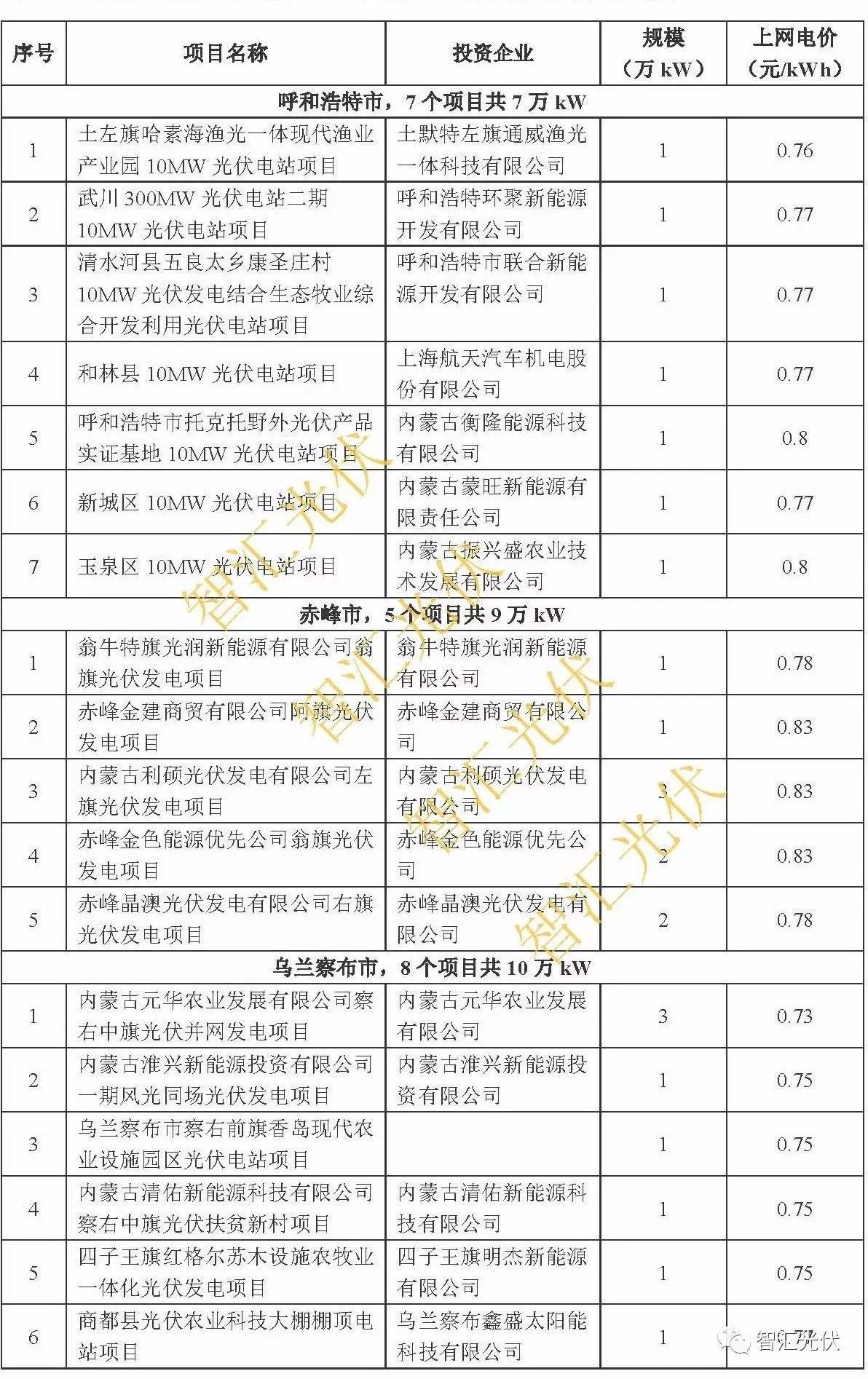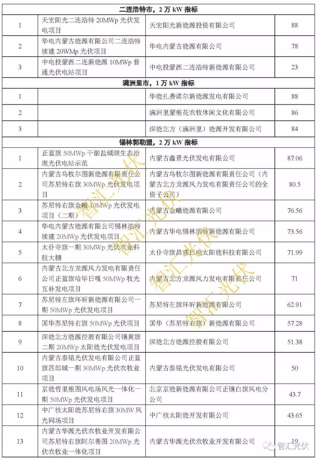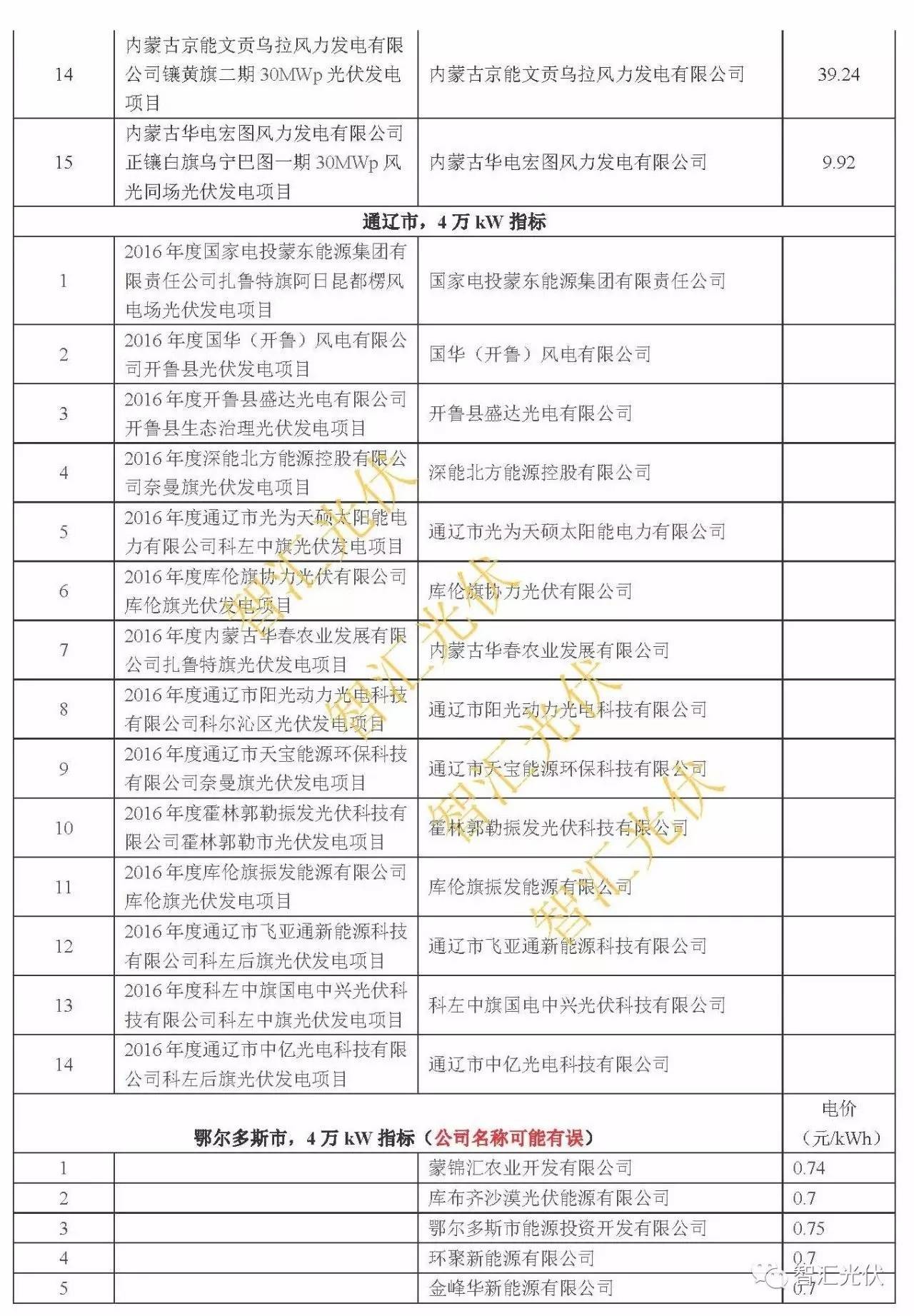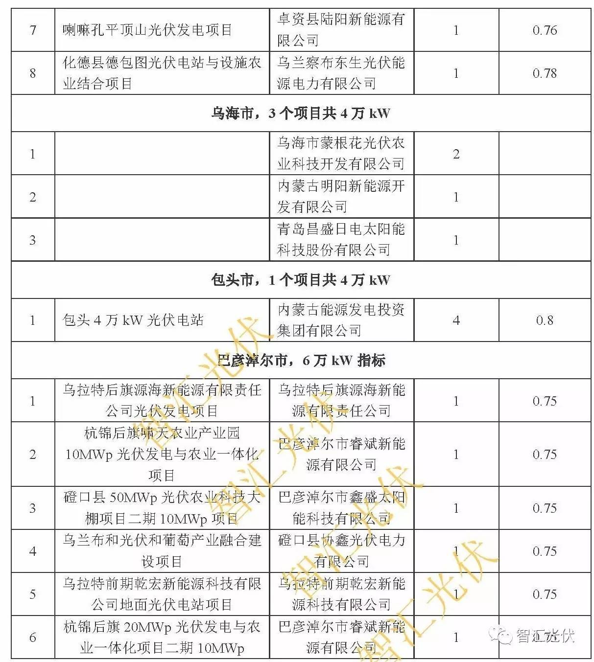 表1:内蒙古自治区2016年普通地面电站项目指标分配情况