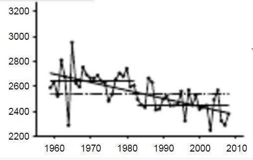 山西省50年(1959~2008年)的年日照时数在2242.75 h~2947.85 h之间(最低值和最高值分别出现在2003年和1965年),近50年呈显著下降趋势,如下图所示。