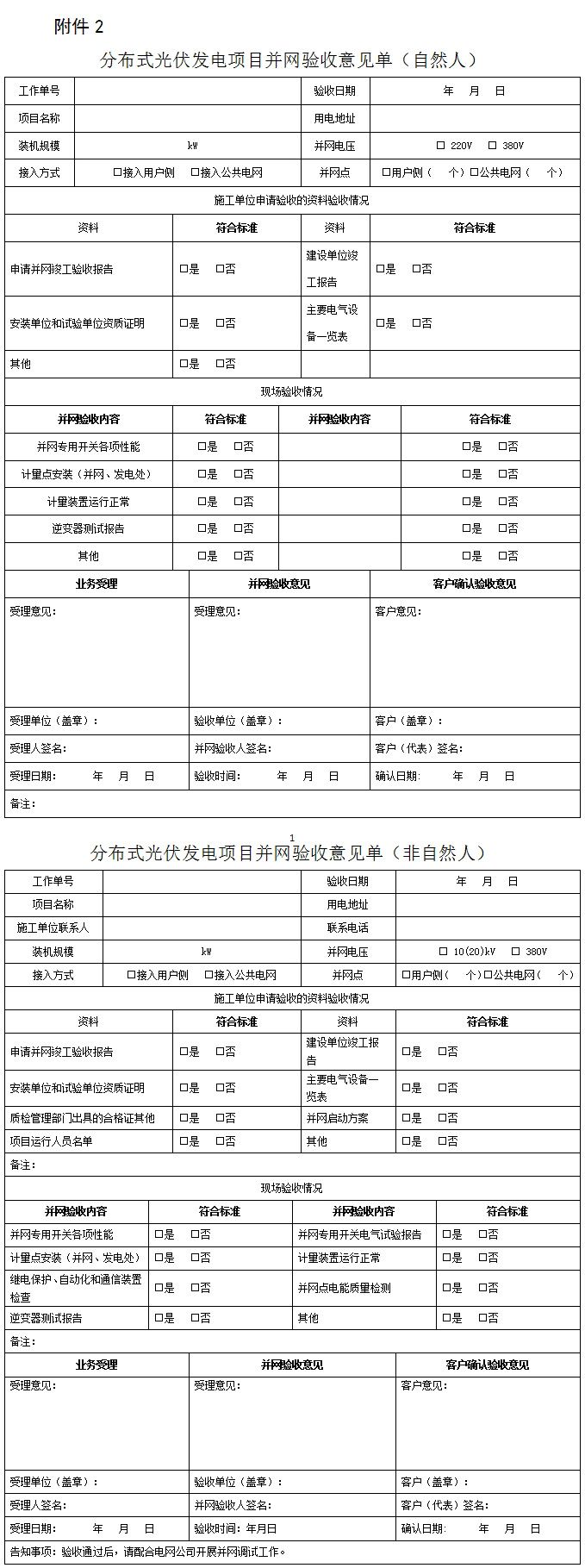 (二)分布式光伏发电项目并网验收意见单(附件2);