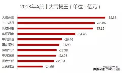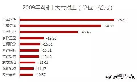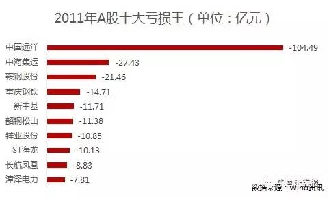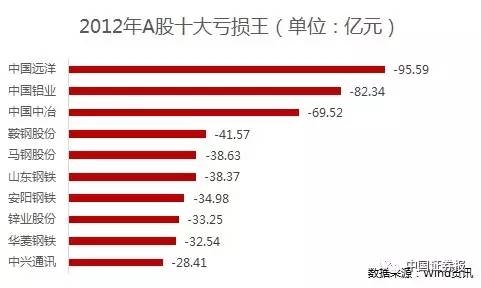 2009年、2011年和2012年的十大亏损王榜首都将被现在已更名为中远海控的中国远洋所占据,亏损额分别高达75.41亿元、104.49亿元和95.59亿元。2007年回归A股后,中国远洋的股价在四个月的时间里从15.52元/股一路攀升至68.4元/股,而随着连年巨亏,其股价也一路下挫,至今已不足6元/股。