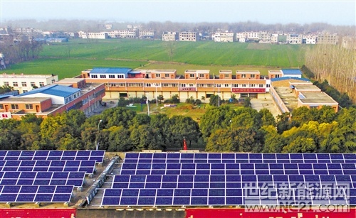河南项城建设在乡镇公共露天场地的太阳能电池板。当地把光伏发电项目作为绿色能源与产业扶贫措施结合起来,在全市15个乡镇42个贫困村的公共露天场地实施安装光伏发电。