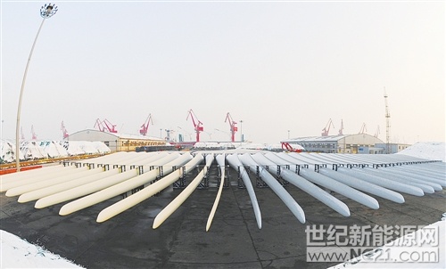 2月1日,一批国产风电叶片在江苏连云港港口码头集结等待装船出口。耿玉和摄