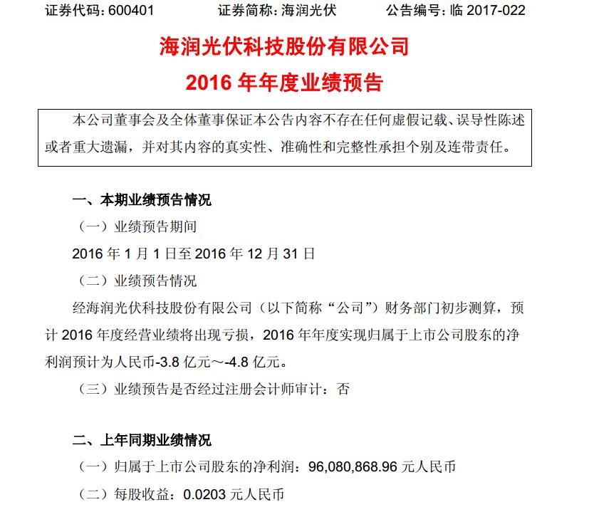 1月26日,官司缠身的海润光伏公告预亏4.8亿,如果抵扣此前的政府补贴1.5亿则该公司16年亏损超过6亿,而前三季度该公司尚且盈利4528万元,对比去年同期,公司盈利9608万元,业绩变脸的故事再次上演,“官司之王”变身亏损之王。