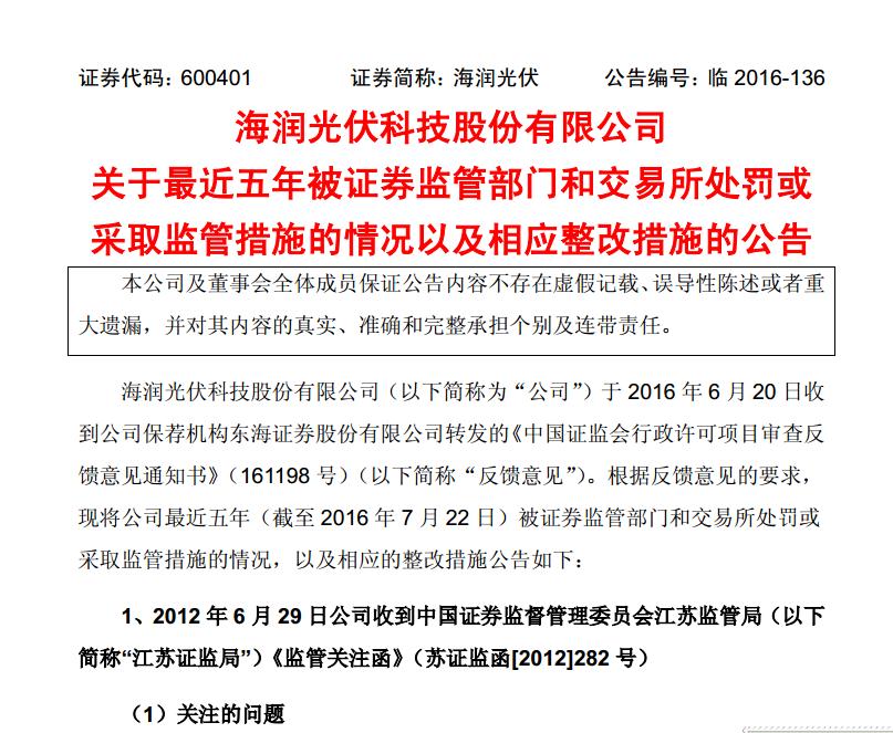 2016年10月上旬,海润光伏发布《涉及诉讼的进展公告》,称共收到646起证券虚假陈述股民索赔案件,诉讼金额共计人民币13531.13万元。