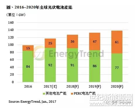 据光伏們了解,截至2016年底,国内的PERC产能已接近4GW,并且TOP 5组件企业对于PERC产线的扩张还在继续,预计将在2017年上半年陆续释放。据台湾调研机构EnergyTrend预测,自2016年开始大幅扩充的PERC产能将在2017年上半年陆续调整完毕,全年度PERC电池产能规模将达到25GW。