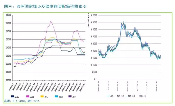欧洲国家中实行绿电配额制的国家有英国、意大利、瑞典、挪威、波兰及罗马尼亚,其它国家的绿证交易只是电力来源标识规定下的自由交易。绿电强制配额和绿证有着相似之处,但是绿证和绿电配额交易是互不相通的,绿证持有不可以抵消绿电配额。从二者价格区别上可以更加明确这一点,图左是北欧斯堪的纳维亚水电站从2010到2014年间的绿证价格发展,基本在0.2欧/MWh到0.8欧/MWh之间浮动,其中2011年3月的福岛第一核电站事故刺激绿证价格大幅上抬(紫色折线),随后又归于平稳。图右是2006到2012年挪威的绿电配额elcert价格,最高可达38欧/MWh(376SEK/MWh)。绿证及绿证强制配额价格间的巨大差异与政策推行的目的达成呈正相关,却又影响强制配额执行方的利益发展,所以二者之间的平衡点或者其它创新或许可成为新的模式。