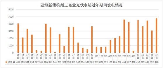 位于杭州地区的工商业光伏电站在过年期间的发电表现不佳,分析原因较大因素由于过年期间浙江地区的天气气候造成,在个别天数中,电站的发电量仅有三位数,但同时也随着冷空气的结束,进入2月中旬,电站的发电量开始趋于正常,最高2月14日达到了4786度。