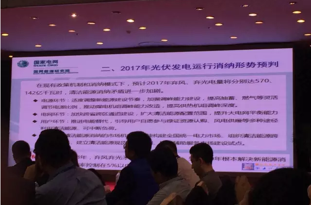 研讨会上,国网能源研究院新能源与统计研究所所长李琼慧,对2017年光伏发电运行消纳形势作出预判,预计2017年弃光电量达到142亿千瓦时,消纳矛盾进一步加剧。