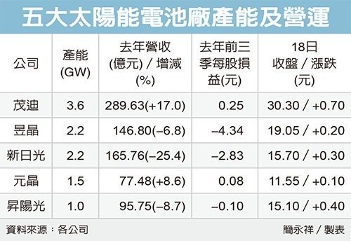 茂迪目前太阳能电池年产能为3.6GW、昱晶为2.2GW、新日光为2.2GW、元晶为1.5MW,升阳科为1GW。