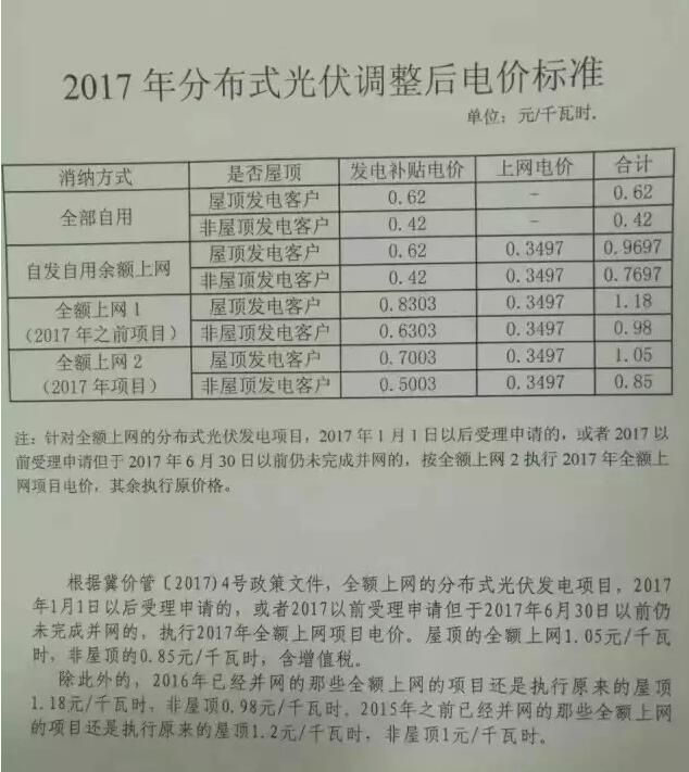 原标题:河北发布2017年分布式光伏电价标准:全额上网屋顶1.05元/千瓦时,非屋顶0.85元/千瓦时
