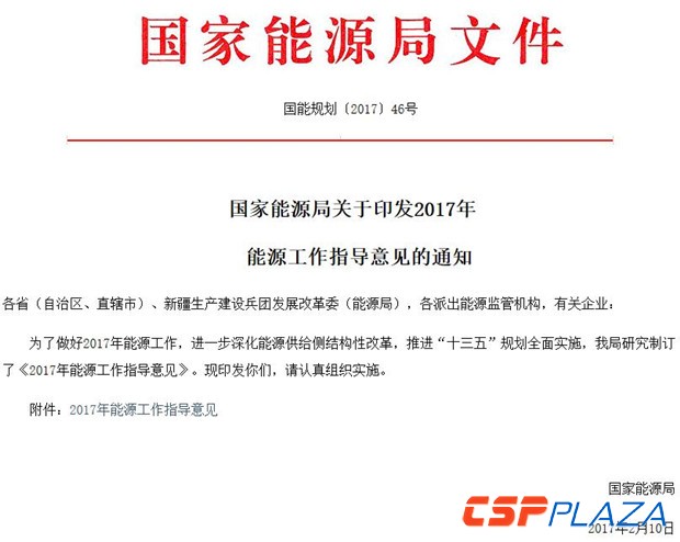 近日,国家能源局下发《2017年能源工作指导意见》(以下简称“意见”)。作为新能源行业的重要组成部分,光热发电在意见中也多次被提及。意见指出,要积极推进光伏光热发电项目建设,稳步推进太阳能热发电首批示范项目,同时要加强太阳能光热利用等领域的关键技术攻关工作。