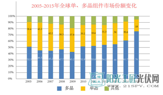 说到这个问题,还要从单多晶历史开始讲起。其实晶硅光伏产业刚开始只有从半导体产业转过来的单晶,没有多晶。但是,单晶成本一直居高不下,进步缓慢;而多晶凭借大规模铸锭技术提升产量,通过高效长晶技术逐步提升效率,性价比高,一直是市场主流。2015年,单晶开始大规模推广金刚线切割,性价比有所提升。