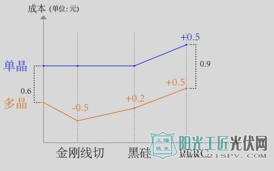 有一个很简单的测算公式,单晶硅片近两年已经完成金刚线切技术应用,目前普通高效单多晶硅片的成本差在6毛左右每片;刚刚大规模量产的金刚线切多晶可以把多晶硅片成本再降低5毛(目前的降本水平,有望继续扩大),差距变为1.1元;单晶使用PERC电池技术成本增加5毛,多晶硅片用湿法黑硅技术成本增加2毛,再使用PERC电池技术成本增加5毛,单多晶PERC电池成本差距变为9毛。