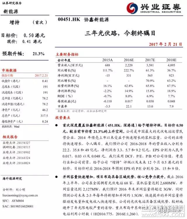 协鑫新能源控股有限公司(以下简称“公司”、“协鑫新能源”,股票代码:0451.HK)是一家全球领先的光伏电站开发与运营商。公司于2014年通过重组方式登陆香港联交所,并作为协鑫集团的下游电站运营平台,在继续经营印刷线路板业务的基础上,开始涉足光伏业务。公司立足江苏苏州,采用集中式光伏电站和分布式光伏电站并重的经营战略,囊括农光、渔光、屋顶、沙漠等多种电站形式。截至2016年6月30日,公司光伏电站项目数量已达68个,遍布全国19个省份,并成功进军光伏需求旺盛的美国和日本市场,总装机容量达2,735MW,已并网容量达2,182MW(我们预测截止2016年底并网容量超过3GW),位列中国光伏电站运营企业中排名第二,民营企业中排名第一。