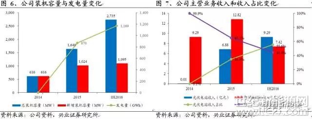 公司自2014年借壳上市以来,并网电站容量快速增长,带动发电量快速增长的同时电费收入快速增长。截至2016年6月30日,公司的总装机容量已达2,735MW。根据管理层指引,公司2016年全年新增装机容量约为2,000-2,500MW。