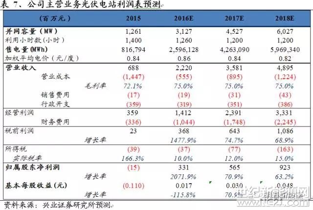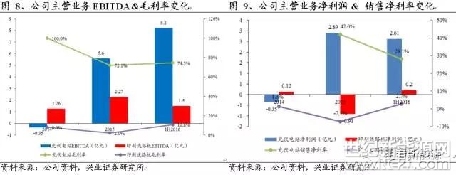 公司的营业收入主要由光伏电站的运营收入和印刷线路板销售收入构成。2016年上半年,公司光伏电站实现营业收入9.29亿元(2014年:0.01亿元;2015年:6.88亿元),占比逐渐扩大。考虑到印刷线路板业务板块已经剥离。预计2017年开始公司的营业收入将全部来自于光伏电站收入。