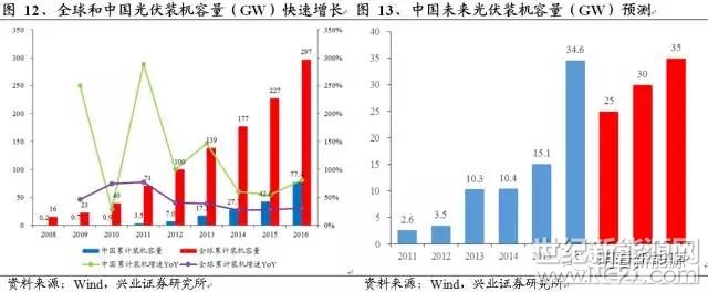 在中国市场,在相继经历了光伏制造产能过剩、欧美的“双反”政策后,国内下游市场开始启动,光伏产业也自2012年开始回暖,随着大型地面电站发电成本的降低、并网率的提高,装机容量呈现高速增长态势。2016年经历了史上最强的上半年抢装后,全年新增装机容量达到34.6GW,累计装机容量达到77GW,继续巩固全球第一光伏大国的地位。展望未来数年,根据政府规划2020年中国非化石能源占一次能源消费比重达15%左右,2030年此数值达20%左右。这意味着要完成上述目标,2020年我国光伏总装机量至少要达到150GW,到2030年时,光伏总装机量需达到400GW。另外根据2016年底发改委能源局发布的《太阳能发展“十三五”规划》,到2020年底光伏装机容量要达到110GW以上,其中光伏发电105GW,光热发电5GW。根据目前中国累计装机77GW的存量分析,未来中国国内年均增长空间超过20GW,我们预计2017年全国新增光伏装机约25GW左右。