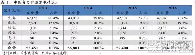 根据统计局数据,2013-2016年,中国电力结构发生了较为明显的变化。火电虽然仍占据绝对主力位置,但发电量占比已持续下降;2016年火力发电占比为71.6%,同比下降2.1个百分点。核电、风电和光伏等新能源发电占比则逐渐上升,2016年已经提升至8.7%。由于起步较早,技术积累和市场开拓也较为成熟,当前的新能源发电中,核电和风电占据90%以上的份额。光伏发电起步较晚,但发展迅速;2016年光伏发电量达到662亿千瓦时,占比已经迅速提升至1.1%。随着技术的逐步成熟和国家的大力推广,未来光伏在国家电力结构中的比重将进一步上升。